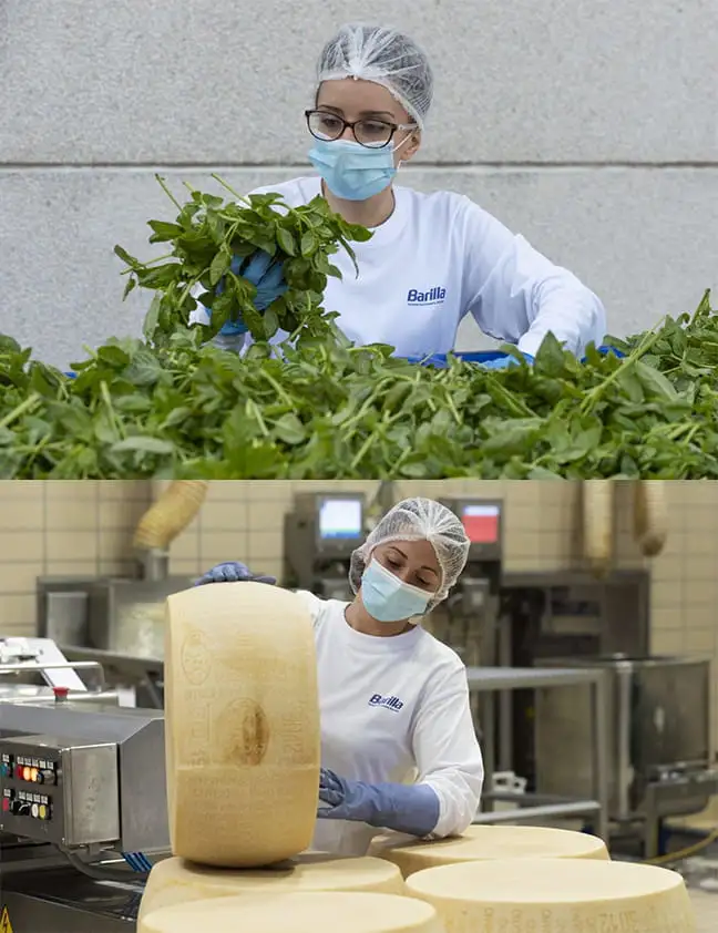 Dentro de nuestra planta en Rubbiano, para preservar el aroma natural del Parmigiano Reggiano DOP, la compramos en ruedas enteras y la rallamos justo antes de agregarla a nuestro Pesto alla Genovese.
