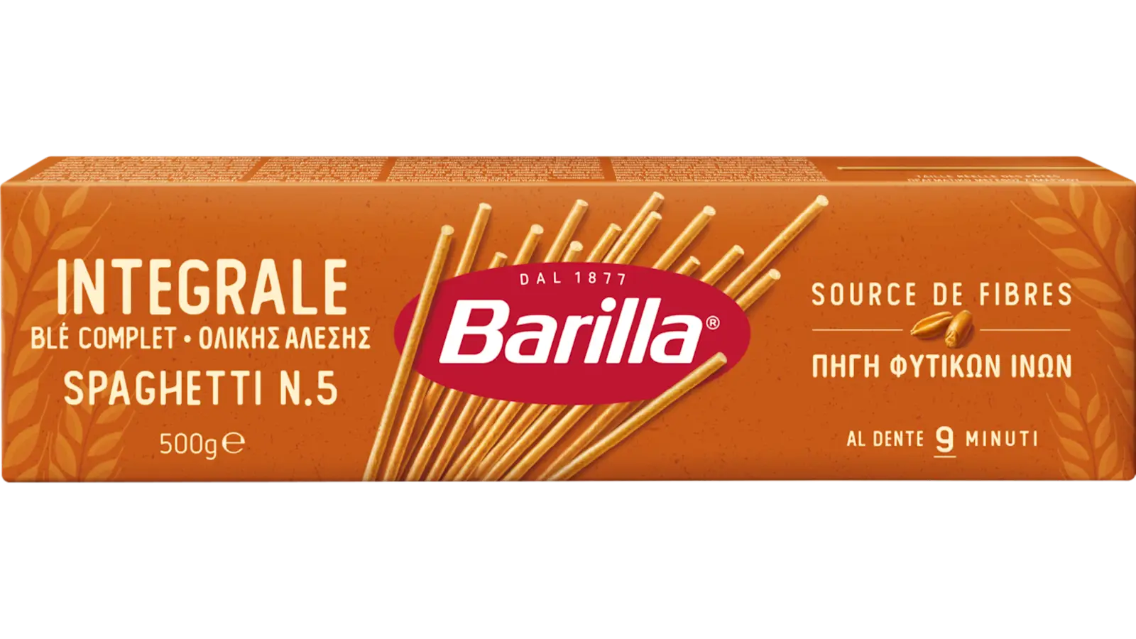 Con la pasta Barilla Integral llevará a su mesa todo el sabor del bienestar. Una porción de pasta Barilla Integral (85 g) aporta más del 20% de la cantidad diaria recomendada de fibra. Su inconfundible color dorado es fruto de un exclusivo método de elaboración de los molinos Barilla, y su perfecta consistencia está diseñada para ofrecer el máximo sabor, siempre al dente. Los Spaghetti Barilla Integrale poseen una excepcional versatilidad y son una fuente natural de fibra. Incluso con un condimento sencillo, llevan a la mesa sabor y autenticidad.