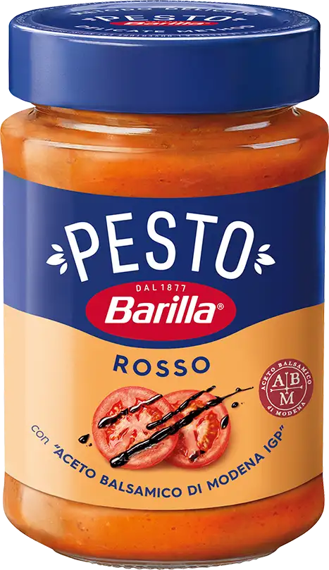 Una receta particularmente sabrosa que combina la riqueza y la consistencia típica del pesto con la sencillez y frescura del tomate y albahaca. El Pesto Rosso Barilla se prepara a partir de ingredientes esenciales de la cocina mediterránea y de la más alta calidad, como tomate, albahaca, Grana Padano y un toque de vinagre balsámico de Módena.